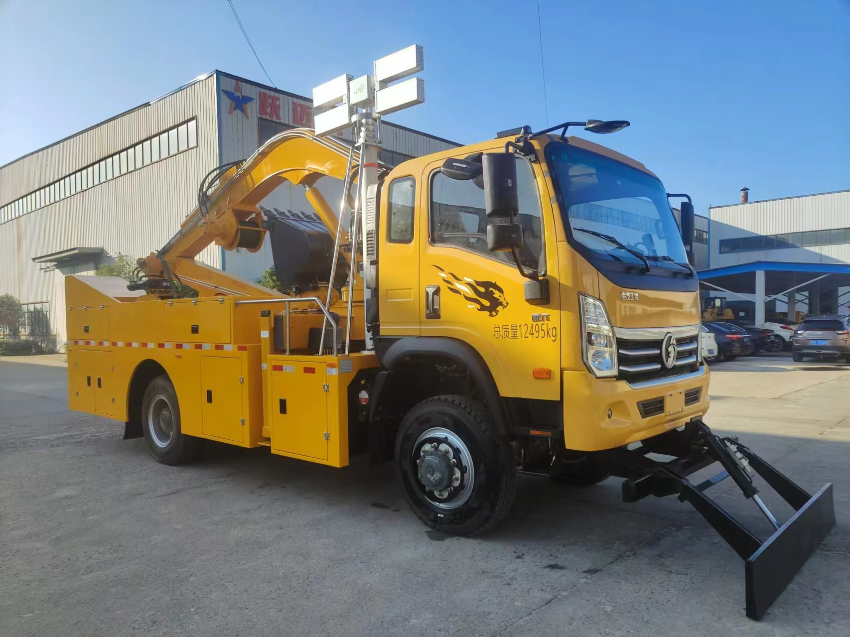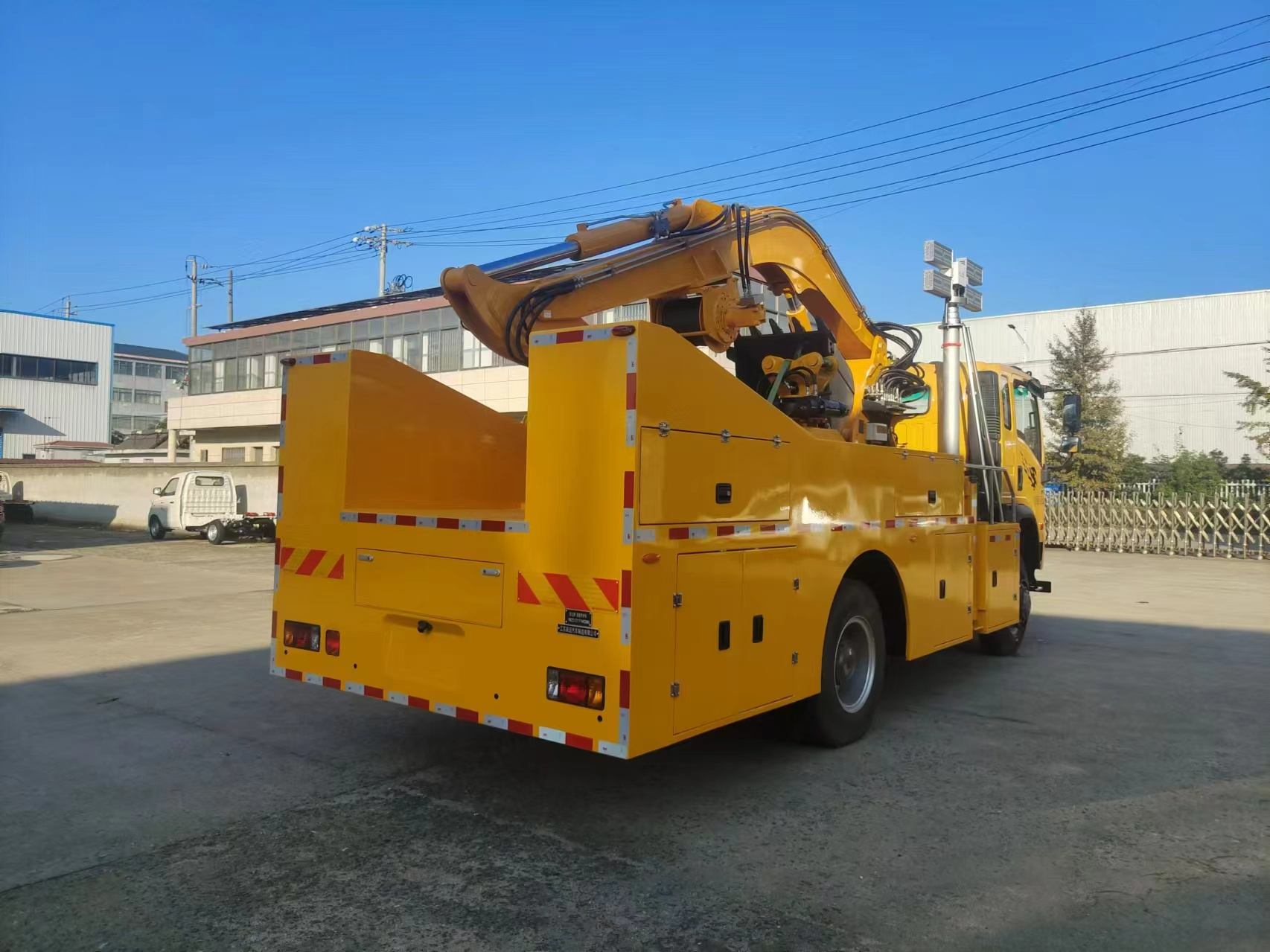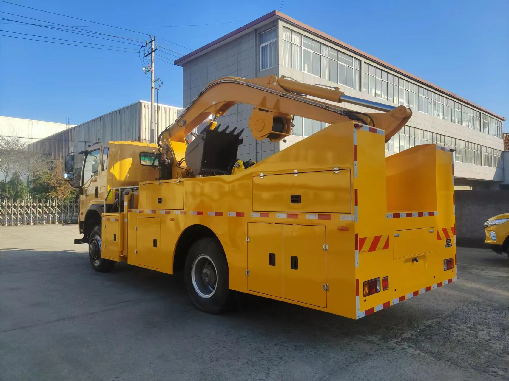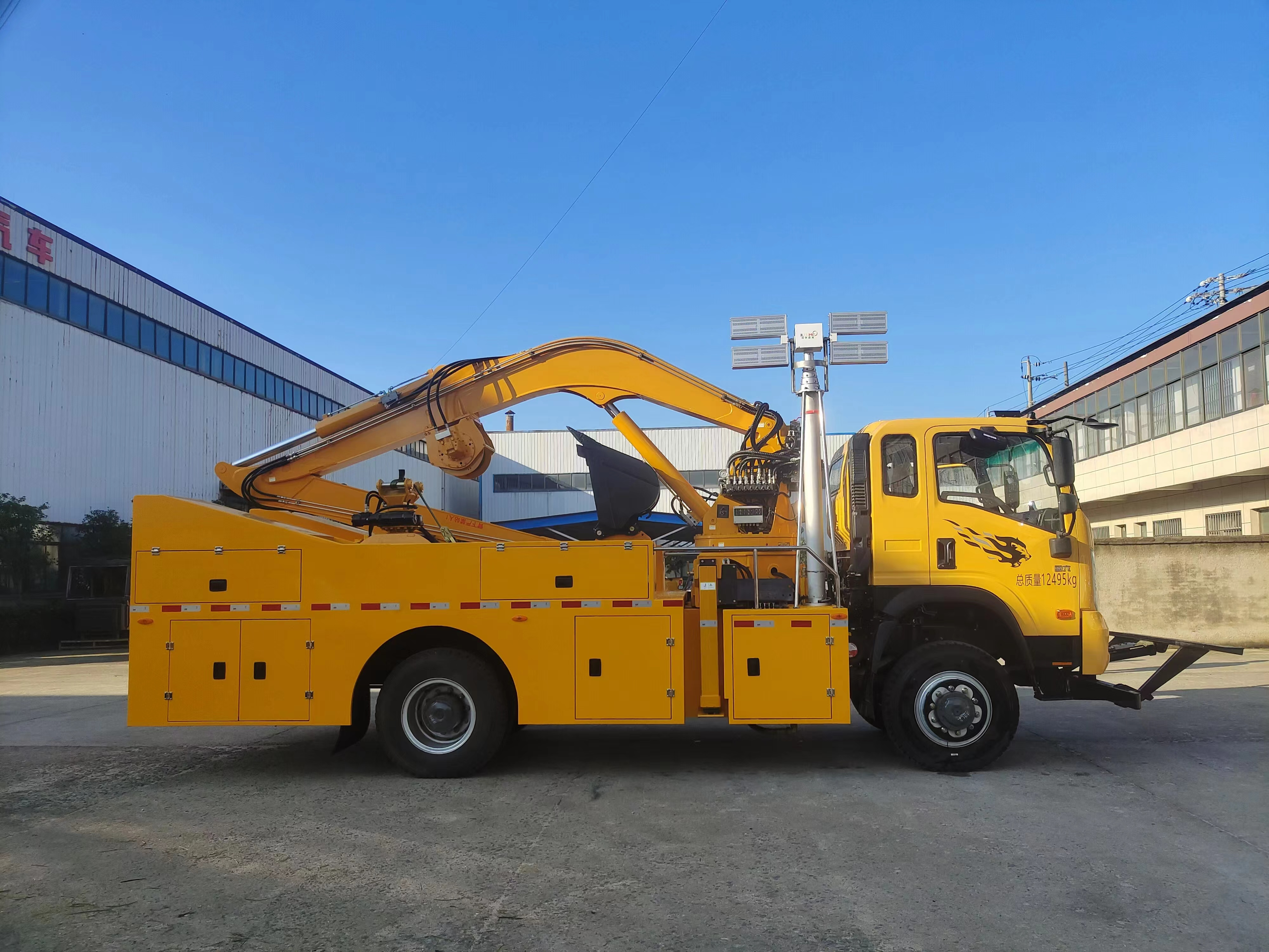 車輛配備舉升臂架、挖斗、破拆錘、抓斗、推鏟、牽引絞盤、發電機組、升降照明燈等搶險裝備,實現多種場景的救援作業;