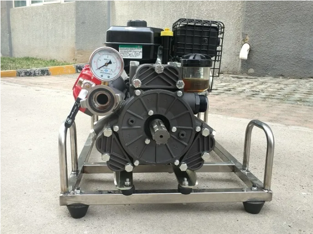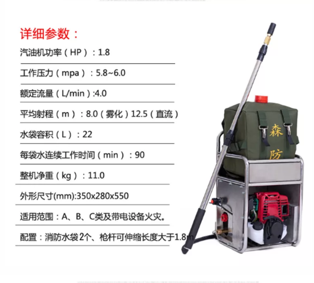 不銹鋼架,便于攜行。泵軸水平布置,減少震動(dòng) 水泵泵體為柱塞液壓隔膜泵。允許砂石顆粒通過,對(duì)水質(zhì)要求低,對(duì)發(fā)動(dòng)機(jī)功率損耗小。 泵組可在橫向、縱向傾斜達(dá)到25°時(shí)正常工作。 水帶直徑40mm,爆破壓力18MPa,表層滌綸長(zhǎng)絲,內(nèi)襯進(jìn)口橡膠,高壓森林接口連接。 水泵配備的動(dòng)力裝置為強(qiáng)制風(fēng)冷四沖程汽油機(jī)。