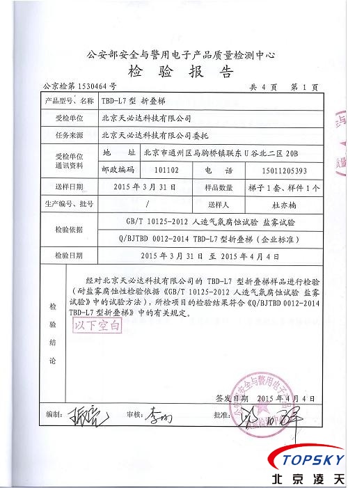 此款折疊梯是由鋁合金材料制成的,連接銷為不銹鋼,操作極為簡便且使用安全可靠。相比于傳統(tǒng)的梯子,它的主要特點(diǎn)是重量輕,折疊后體積小,可以放在一個(gè)小箱子內(nèi),攜帶方便,適用于處理各種緊急情況;例如人質(zhì)救援,包圍犯罪分子,也可以用于水上救援時(shí)做跳板用。 本產(chǎn)品通過公安部安全與電子產(chǎn)品檢測檢驗(yàn)中心檢測,檢測報(bào)告編號:公京檢第1530464號。