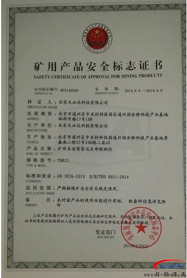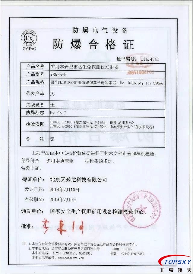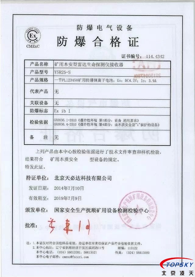 從國家安標中心獲悉,YSR25本安型雷達生命探測儀取得煤安標志認證(證書見下圖),自此,國內本安型可用于爆炸性環(huán)境的探人雷達取得完整下井資質,從研制方獲悉,該設備已在山西陽泉煤業(yè)集團救護大隊、山西潞安集團救護大隊、開灤集團救護大隊進行過工業(yè)性試驗,試驗效果良好,探測距離達到25米(報告見下圖)!