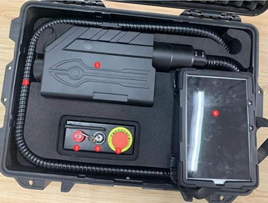 激光破拆工具組+智能遠距離激光切割系統+未爆彈激光銷毀器,破拆工具的六脈神劍。裝置主要由激光發射器機箱、激光發射器(含觀瞄模塊)三腳架轉 臺、外置電池、連接線、手持控制終端、電池充電器等配件組成。