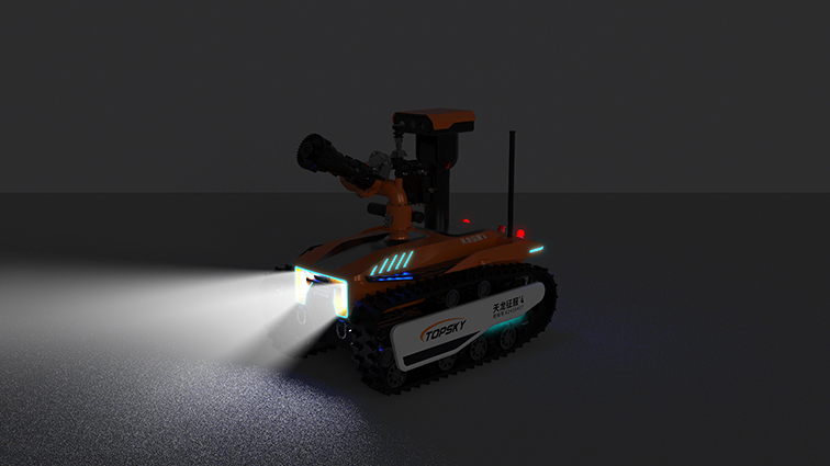 機(jī)器人采用無線遙控設(shè)計(jì),遙控器與監(jiān)視器一體/分離,可實(shí)時(shí)的顯示電池、內(nèi)部的各種信息,機(jī)器人狀態(tài)、現(xiàn)場溫濕度、有毒有害氣體濃度報(bào)警信息等控制機(jī)器人前進(jìn)、后退、轉(zhuǎn)向等運(yùn)動(dòng)。具備遠(yuǎn)程偵察能力,機(jī)身搭建升降云臺、高清攝像頭、熱成像攝像頭、氣體傳感器三類環(huán)境感知設(shè)備和云臺控制設(shè)備,也可聯(lián)動(dòng)聲光報(bào)警模塊提醒消防人員或群眾,有效避免危險(xiǎn)。在通過遠(yuǎn)程偵察手段有效獲取現(xiàn)場火源信息后,機(jī)器人配備的大功率電機(jī)可以幫助消防人員將消防水袋拖拽至危險(xiǎn)火源區(qū)域進(jìn)行滅火,并能搭載各類國內(nèi)、外的多種消防水泡,并能夠遠(yuǎn)程控制發(fā)射水或泡沫?;谒鋫涞氖耙裟K和揚(yáng)聲器模塊,拾取現(xiàn)場環(huán)境聲音,即使消防官兵未靠近消防現(xiàn)場也能夠聽到搜救現(xiàn)場的群眾呼救聲,并通過揚(yáng)聲器模塊與群眾進(jìn)行現(xiàn)場對話。