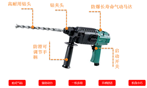 主要用于巖石,磚墻,混凝土等構(gòu)件上鑿孔,作安裝管道、架設(shè)動(dòng)力線(xiàn)路、安裝地腳螺栓、化工廠(chǎng)、精煉廠(chǎng)、建筑、重工業(yè)、危險(xiǎn)潮濕的隧道、水下及狹窄的空間作業(yè);尤其在高瓦斯防爆礦井中,氣動(dòng)防爆無(wú)火花更能體現(xiàn)安全性。它是提高工效,減輕勞動(dòng)強(qiáng)度的工具.