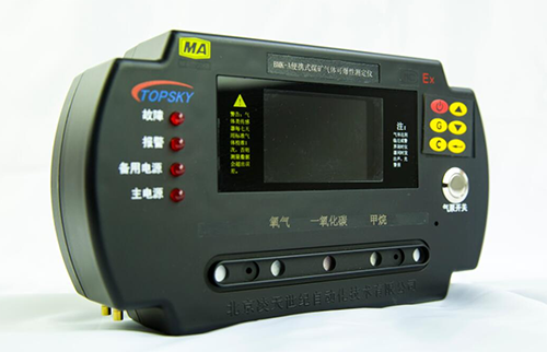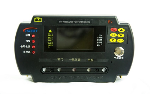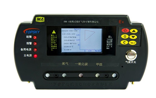 BMK-A便攜式煤礦氣體可爆性測定儀(以下簡稱測爆儀),是用于煤礦井下使用的礦用本安兼隔爆型攜帶式儀器。測爆儀用于煤礦井下,由礦山救護(hù)隊(duì)員攜帶進(jìn)入災(zāi)區(qū),監(jiān)視作業(yè)環(huán)境周圍氣體組份是否存在爆炸危險(xiǎn)。也可由消火人員攜帶,在處理自然發(fā)火或啟封火區(qū)過程中,檢測周圍環(huán)境或密閉內(nèi)空氣中甲烷、氧的濃度值,在儀器液晶顯示屏上直接顯示出O2、CH4、CO的濃度值和環(huán)境溫度值,并顯示出“爆炸三角形”的圖形及各氣體組份所構(gòu)成的坐標(biāo)點(diǎn),臨近或達(dá)到警界限時(shí)儀器同時(shí)發(fā)出聲、光警報(bào)。