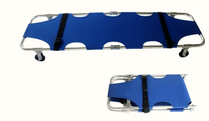 本產品又名擔架、折疊擔架、鋁合金擔架、鋁合金折疊擔架、簡易擔架等。擔架面采用藍色牛津革面制成,使病員躺臥更舒適。采用一端兩輪一端兩支撐腳設計,在人手不夠的情況下抬起支撐腳一端即可轉移病人。支撐腳及腳輪可折看收納,使用更方便。本產品配備兩根安全綁帶,保證運輸途中病人的安全