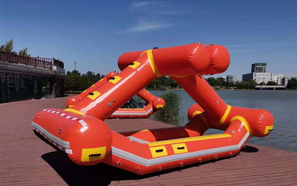 2. ★高處救援:2名成年人站在自扶正激流救生艇頂部,未見(jiàn)頂部氣柱明顯變形和傾倒。