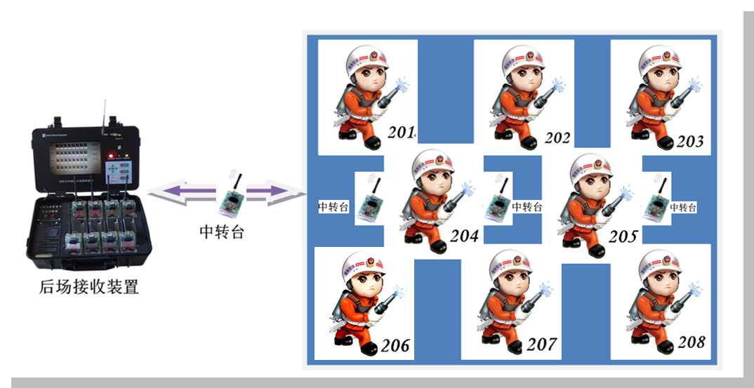 指揮員可根據監視的情況,發出單呼巡查,群呼巡查,單呼撤退,群呼撤退的指令。呼救器佩戴人員可實時接收指令,通過聲響提示查看巡查和撤退的狀態,實時 互動回應,為指揮員直觀判斷現場的情況,提供非常可靠的指揮依據。該設備配套的呼救器具有遠距離數據通信功能,具有群組獨立使用的功能。其中一個呼救器報警,群組呼救器都能有聲響提示,顯示報警的編組編號,兼有現場指揮員主呼撤退的功能。每套產品編組顯示:1-4組,每組編號顯示:1-8人 ,每套最大使用數量32人,可編不同ID套數:40套,可編不同組號:160組,可編不同ID號:1280個編號 。
